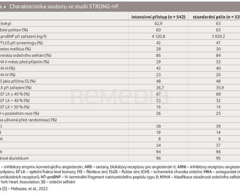 Aktualizace 2023 pro péči o pacienty s akutním srdečním selháním vychází z výsledku studie STRONG‑HF (The Safety, Tolerability and Efficacy of Rapid Optimization of Heart Failure), která byla publikována v roce 2023 [5]. Do studie byli zařazeni pacienti přijatí do nemocnice pro akutní srdeční selhání, na studii se podílelo 87 nemocnic ze 14 zemí. Pacienti byli před propuštěním z nemocnice randomizováni k běžné péči a k intenzivní péči. Běžná péče zahrnovala běžnou péči o pacienty, intenzivní péče pak titraci léků s cílem dosáhnout 100 % doporučené dávky při následných kontrolách během dvou týdnů od propuštění a dalších čtyř návštěv po dvou měsících s klinickými kontrolami a laboratorním vyšetřením včetně stanovení hodnoty NT‑proBNP. Primárním sledovaným ukazatelem byla rehospitalizace pro srdeční selhání nebo celková mortalita během 180 dnů. Do studie bylo randomizováno 1 078 pacientů, 542 k intenzivní péči a 536 k běžné péči. Charakteristiky souboru přibližuje tabulka 4.