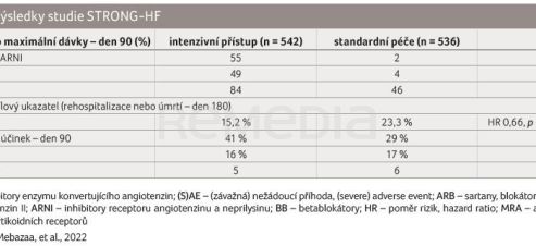 Výsledky byly významné ve prospěch intenzivní péče. Více pacientů v intenzivní skupině dosáhlo maximální dávky ACEI, ARB, ARNI, betablokátoru (BB) a MRA. Počet úmrtí a rehospitalizací pro srdeční selhání byl významně nižší u pacientů v intenzivní ambulantní péči než u pacientů s běžnou péčí (tab. 5). V intenzivní skupině bylo referováno více nežádoucích příhod, nebyl však zjištěn rozdíl ve výskytu závažných a fatálních nežádoucích příhod.