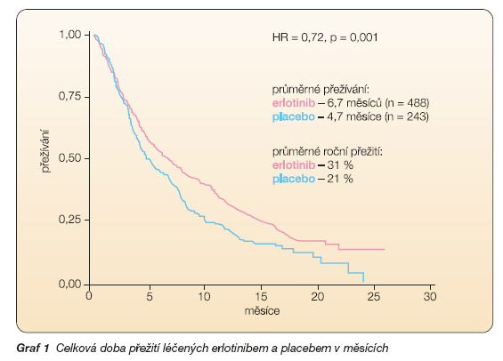 Účinnost a bezpečnost erlotinibu u NSCLC byla stanovena v randomizované dvojitě zaslepené, placebem kontrolované klinické studii (BR.21) u 731 pacientů s lokálně pokročilým nebo metstazujícím nemalobuněčným karcinomem plic po selhání alespoň jednoho režimu chemoterapie. V této studii byli pacienti randomizováni v poměru 2 : 1 do skupiny, v níž byl perorálně podáván přípravek erlotinib v dávce 150 mg jednou denně, a do skupiny, v níž bylo podáváno placebo. Výstupy studie zahrnovaly celkovou dobu přežití, čas do zhoršení příznaků spojených s nádorem plic (kašel, dušnost a bolest), celkovou léčebnou odpověď, délku trvání odpovědi, dobu přežití bez známek progrese choroby a bezpečnost. Primárním konečným výstupem studie byla doba přežití (graf 1) signifikantně delší ve skupině nemocných, jimž byl podáván erlotinib [19].