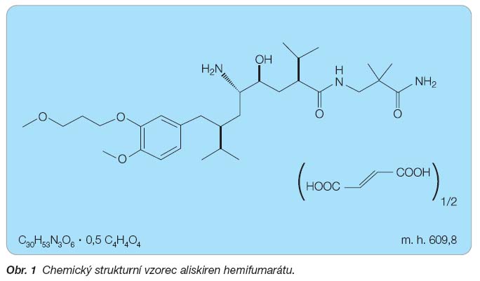 Aliskiren hemifumarát je chemicky (2S, 4S, 5S, 7S)-N-(2-carbamoyl-2-methylpropyl)-5-amino-4-hydroxy-2,7-diisopropyl-8 -[4-methoxy-3-(3-methoxypropoxy)phe nyl]-octanamid hemifumarát ( obr. 1 ).