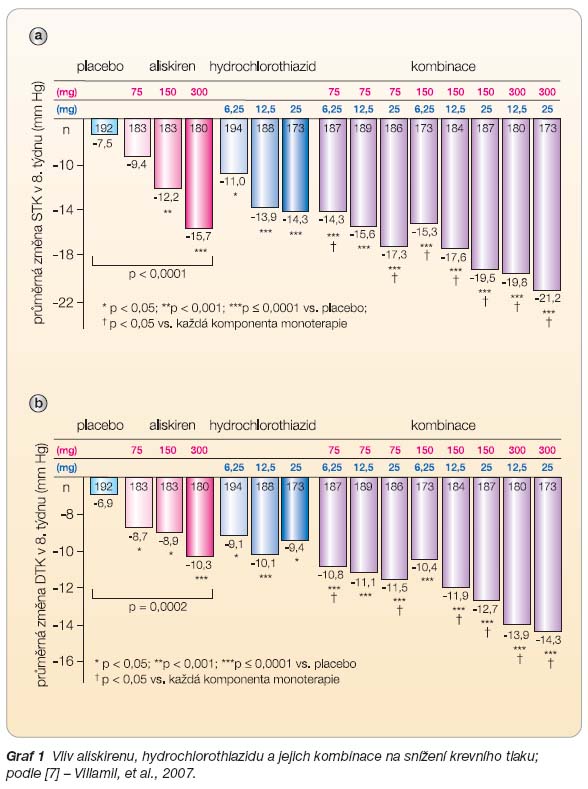 Villamil a kol. [7] porovnali aliskiren s hydrochlorothiazidem u 2276 pacientů. Srovnávali účinnost 150 mg a 300 mg aliskirenu s následujícími dávkami hydrochlorothiazidu: 6,25 mg, 12,5 mg a 25 mg denně. Aliskiren v dávce 300 mg snižoval mírně systolický a diastolický tlak v porovnání s hydrochlorothiazidem v dávce 25 mg; nevykazoval vyšší účinnost než hydrochlorothiazid, jejich kombinace však vedla k výraznějšímu poklesu krevního tla ku ( graf 1 ). Snížení PRA, k němuž dochá zí při monoterapii aliskirenem i při léčbě kombinací aliskirenu s hydrochlorothiazidem, přetrvávalo až měsíc po náhlém ukonče ní léčby aliskirenem.