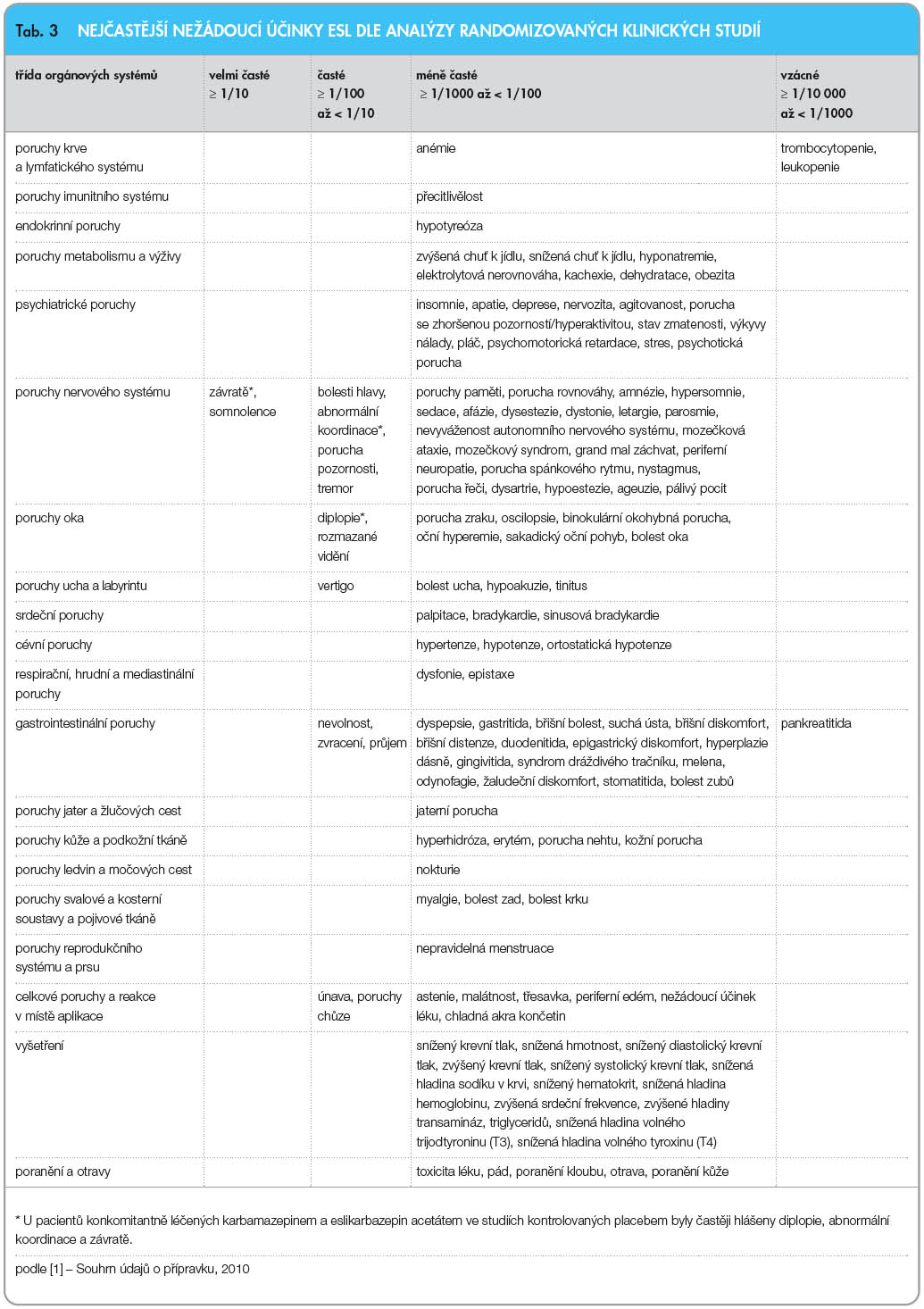 V randomizovaných klinických studiích byla většina nežádoucích účinků souvisejících s léčbou mírná nebo střední. Nejčastěji se vyskytovaly závratě, ospalost, bolesti hlavy, diplopie, rozmazané vidění, poruchy koordinace, tremor, poruchy chůze a nevolnost. V tab. 3 jsou uvedeny všechny nežádoucí účinky, které se objevily ve studiích s větší četností než při podávání placeba a vyskytly se u více než jednoho pacienta. Při podávání ESL bylo zjištěno prodloužení PR intervalu; u léčených pacientů se mohou vyskytnout nežádoucí účinky s tím spojené – AV blok, synkopa, bradykardie.