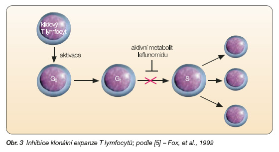 Dochází tedy k inhibici proliferace aktivovaných T lymfocytů v G1 fázi buněčného cyklu (obr. 3). Byly popsány i účinky na proliferaci B buněk, jejich diferenciaci a sekreci auto-protilátek [4]. Bylo prokázáno, že leflunomid ovlivňuje proliferaci B buněk závislou i nezávislou na T buňkách. Dalším popsaným mechanismem účinku je inhibice NF-kb, inhibice exprese adhezivních molekul a inhibice chemotaxe leukocytů, účinek na různé tyrozinkinázy [5]. Leflunomid byl zkoušen na řadě modelů autoimunitních onemocnění, jako je myasthenia gravis, proteoglykany indukovaná artritida, krysí adjuvantní artritida a systémové vaskulitidy [6].