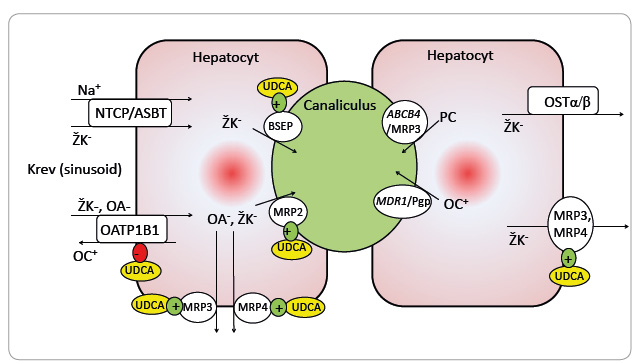 MRP2 a MRP4 a zároveň snižuje expresi ASBT (apical sodium dependent bile acid transporter); celkově tak dochází ke zvýšení koncentrace sérových ŽK a ke zvýšení renální exkrece ŽK [3,7]; e) inhibice syntézy ŽK, podpora jejich hydroxylace – UDCA snižuje expresi CYP7A1, tedy limitující krok v syntéze ŽK, a navíc zvyšuje expresi CYP3A11, CYP2B10 a CYP3A4 – enzymů katalyzujících hydroxylace primárních ŽK na hydrofilnější (méně toxické) ŽK [3,11].