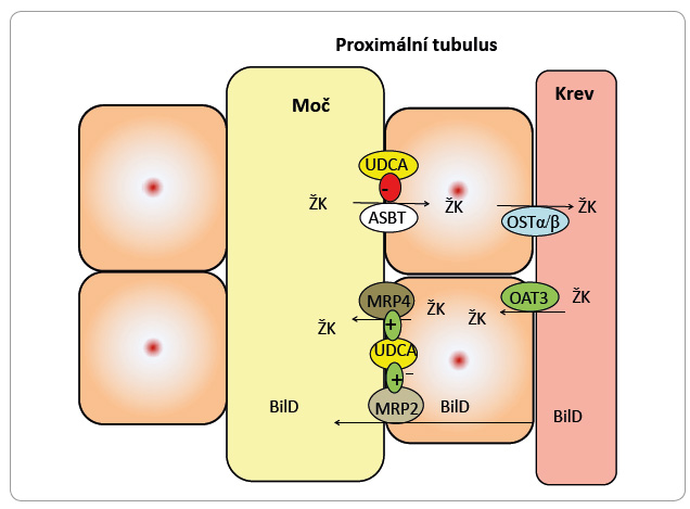 anion transporting polypeptide 1, OATP1) [3,6]; b) up regulace efluxních transportérů MRP3 a MRP4 (multidrug resistance associated protein) na bazolaterální straně [7,8]; c) up regulace hepatocelulárních kanalikulárních transportérů BSEP (bile salt export pump) a MRP2 [3,6,9]; d) změna exprese transportérů v ledvinách (obr. 4) – UDCA zvyšuje expresi efluxních transportérů