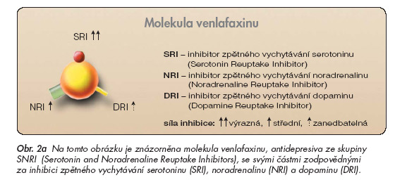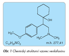 Venlafaxin je antidepresivum, které inhibuje zpětné vychytávání serotoninu a noradrenalinu. V řadě metodicky dobře provedených studií byla prokázána jeho účinnost v léčbě různých druhů depresivní poruchy včetně farmakorezistentní formy. Při terapii deprese je minimálně stejně účinný jako TCA, jeho efekt se zdá být stejný nebo vyšší než u SSRI. Na druhou stranu je však třeba poznamenat, že pokud jsou venlafaxinem léčeni pacienti s depresivní fází bipolární afektivní poruchy, existuje vyšší riziko přesmyku do mánie, než je tomu při léčbě SSRI, např. paroxetinem [34]. Byla prokázána krátkodobá i dlouhodobá účinnost venlafaxinu u generalizované úzkostné poruchy a u sociální fobie. Další práce naznačují, že by toto SNRI mohlo být účinné i v dalších indikacích, např. u panické úzkostné poruchy, posttraumatické stresové poruchy nebo u algického syndromu. Venlafaxin je obvykle dobře snášen. Ve srovnání s TCA představuje výrazně bezpečnější způsob terapie. Ve srovnání s SSRI se na začátku léčby vyskytuje častěji nauzea. Při vyšším dávkování je u malé části pacientů přítomno riziko zvýšení krevního tlaku. Retardované lékové formy venlafaxinu (ER) jsou vzhledem ke snížení maximální denní dávky a podávání jednou denně lépe snášeny a pravděpodobnost zvýšení krevního tlaku je při jejich užívání nižší. Venlafaxin má nízký potenciál rizika vzniku lékových interakcí způsobených ovlivněním cytochromového systému P-450. Při terapii venlafaxinem je pro vzácnou možnost vzniku serotoninového syndromu třeba věnovat pozornost především jeho kombinaci s jinými léčivy se serotoninergním účinkem. Pozornost si zasluhují nová zjištění týkající se jeho toxicity při předávkování a z toho plynoucí zvýšená opatrnost u pacientů se suicidiálními tendencemi.