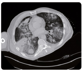 Pacient (ročník 1961) přichází s prvními příznaky nemoci do naší ambulance koncem května 2014 pro hmotnostní úbytek 7 kg za tři měsíce a s pocitem dušnosti provázeným suchým pokašláváním. Muž je jen příležitostným kuřákem, bez komorbidit, pracuje jako operátor na velíně. Na skiagramu hrudníku (obr. 1) nález hodnotíme jako nejspíše pokročilý tumor horního laloku pravé plíce. Na CT (computed tomography, počítačová tomografie) hrudníku a horní části břicha ze dne 22. května 2014 (obr. 2) nacházíme v S1/3 pravé plíce spikulovité ložisko o velikosti 43 mm × 39 mm × 47 mm – nejspíše primární bronchogenní karcinom. V plicích jsou přítomny difuzně oboustranně mnohočetné metastázy v rozsahu 5–30 mm, vpravo zhruba 19 mm, vlevo 30 mm, parahilózně a v dolních lalocích karcinomatózní