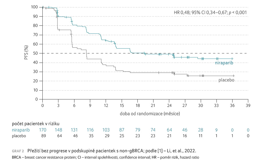 U pacientek s non-gBRCA bez deficitu homologní rekombinace byl medián PFS 14,0 měsíce (95% CI 11,9–NE) oproti 5,5 měsíce (95% CI 2,9–7,3) v niraparibové, resp. placebové skupině (HR 0,41; 95% CI 0,25–0,65; p < 0,001).