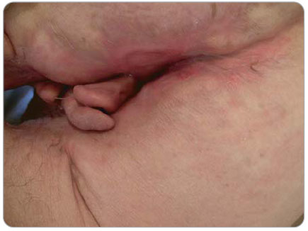 v podkoží perianální, perineální a skrotální krajiny. Anální kanál byl hladký, v místě linea dentata drobná píštěl s hnisavou sekrecí. Píštěle byly chirurgicky ošetřeny. I přes veškerou léčbu přetrvávala hnisavá sekrece z mnohočetných píštělí s těžkým poškozením perineogenitální krajiny, která byla řešena založením derivační sigmoideostomie 11. 4. 2006. Po založení se podařilo zvládnout chronickou sepsi, ale přetrvávaly rozsáhlé perineogenitální kožní defekty. Po docílení negativních výsledků z kožních stěrů a následné konzultaci s plastickým chirurgem byla plánována autologní transplantace kůže perinea. Před tímto výkonem byla znovu provedena EUA dne 11. 9. 2006, při které byla snesena hypovitální tkáň se širokou excizí do zdravé tkáně. Při histologickém vyšetření byla ve