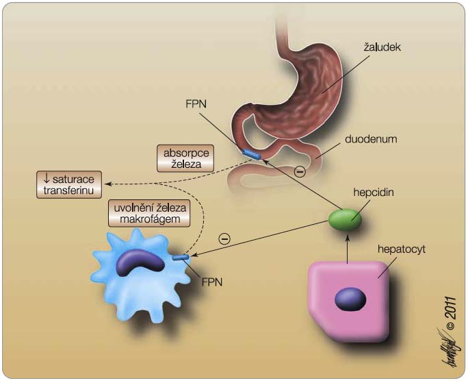 Anémie u nádorových onemocnění je komplexní povahy [2]. Může vznikat z různých příčin, které se často vzájemně kombinují. Na jejím vzniku se podílí především samotné nádorové onemocnění. Nádorové buňky a buňky imunitního systému produkují četné cytokiny s inhibičním účinkem na krvetvorbu, jako je TNF-a (tumor necrosis factor a), některé interleukiny (IL-1, IL-4, IL-6, interferon g). Tyto cytokiny přispívají ke vzniku anémie nejméně dvojím mechanismem [3]. Jednak potlačují produkci erytropoetinu a tvorbu erytroid-ních prekurzorů a tím snižují produkci ery-trocytů, jednak ovlivňují metabolismus železa. Stimulují tvorbu feritinu a hepcidinu [4]. Hepcidin se uplatňuje v regulaci příjmu a výdeje železa buňkou tím, že inhibuje funkci ferroportinu – bílkoviny zod-povědné za transport železa z buňky do extracelulárního prostoru. Výsledkem je pokles koncentrace železa v séru s jeho retencí intracelulárně v buňkách monocyto-makrofágového systému a sekundárně též inhibicí vstřebávání železa z trávicího traktu. Mírně se snižuje saturace transfe-rinu, kdežto hodnoty sérového feritinu jsou zpravidla normální (obr. 1). Tyto mechanismy jsou charakteristické pro anémii chronických onemocnění, která bývá u nádorových onemocnění nejčastějším typem anémie.