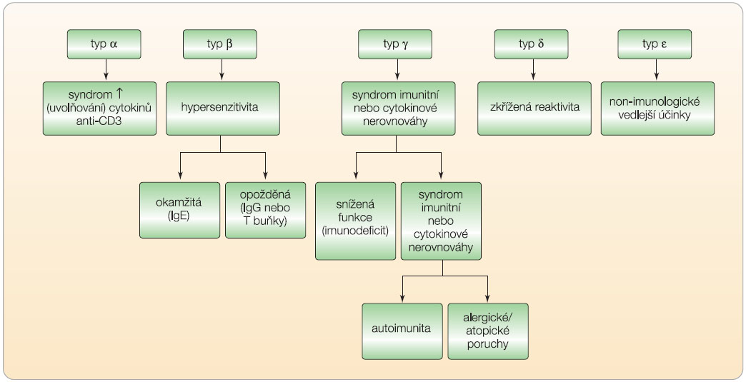 Nový princip a mechanismus účinku, který biologická léčba přinesla, si našel své odpůrce a skeptiky, hlavně z řad odborníků upozorňujících na možné nežádoucí účinky těchto agens. Ukázalo se, že vedlejší a nežádoucí účinky doprovázejí tuto léčbu stejně jako standardní farmakoterapii, pouze je nutno k charakteru účinku přistupovat z jiného pohledu. Proto byl vypracován protokol pěti hlavních kategorií nežádoucích účinků biologické léčby, znázorněný na obr. 2.