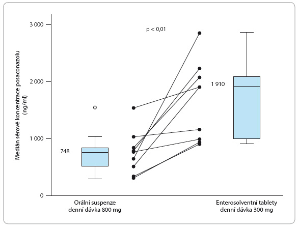 í bylo dosaženo při průměrné plazmatické koncentraci (plasma Cavg) v rozmezí > 400–1 250 ng/ml (53–75 %). Cornely a kol. [12] v profylaktické studii s použitím tablet u hematologických pacientů (n = 210) dosáhli při podávání dávky 300 mg 1× denně (1. den 2× 300 mg) u 81 % nemocných cílové plazmatické koncentrace 500–2 500 ng/ml s průměrem (plasma Cavg) 1 580 ng/ml. Účinnost tablet v jedné denní dávce 300 mg potvrdil v podobné profylaktické studii také Duarte a kol. [13]. Prioritu tablet přesvědčivě demonstruje malá srovnávací studie Junga a kol. [14], ve které autoři zaměnili u 12 nemocných s leukemií orální suspenzi posaconazolu za enterosolventní tablety. Medián sérové koncentrace se tak zvýšil ze 748 ng/ml na 1 910 ng/ml (p < 0,01), aniž by došlo ke vzniku klinicky relevantní hepatotoxicity (graf 1).